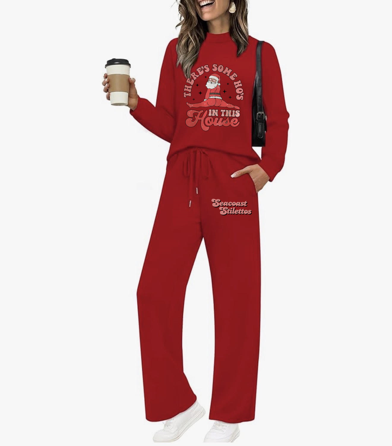 The top features a bold, playful holiday graphic: “There’s Some Ho’s In This House” alongside a sassy Santa serving a full split—because of course he is. The pants complete the custom look with “Seacoast Stilettos” printed on the thigh, giving this set an exclusive, team-only vibe.