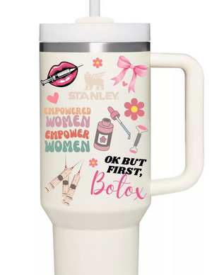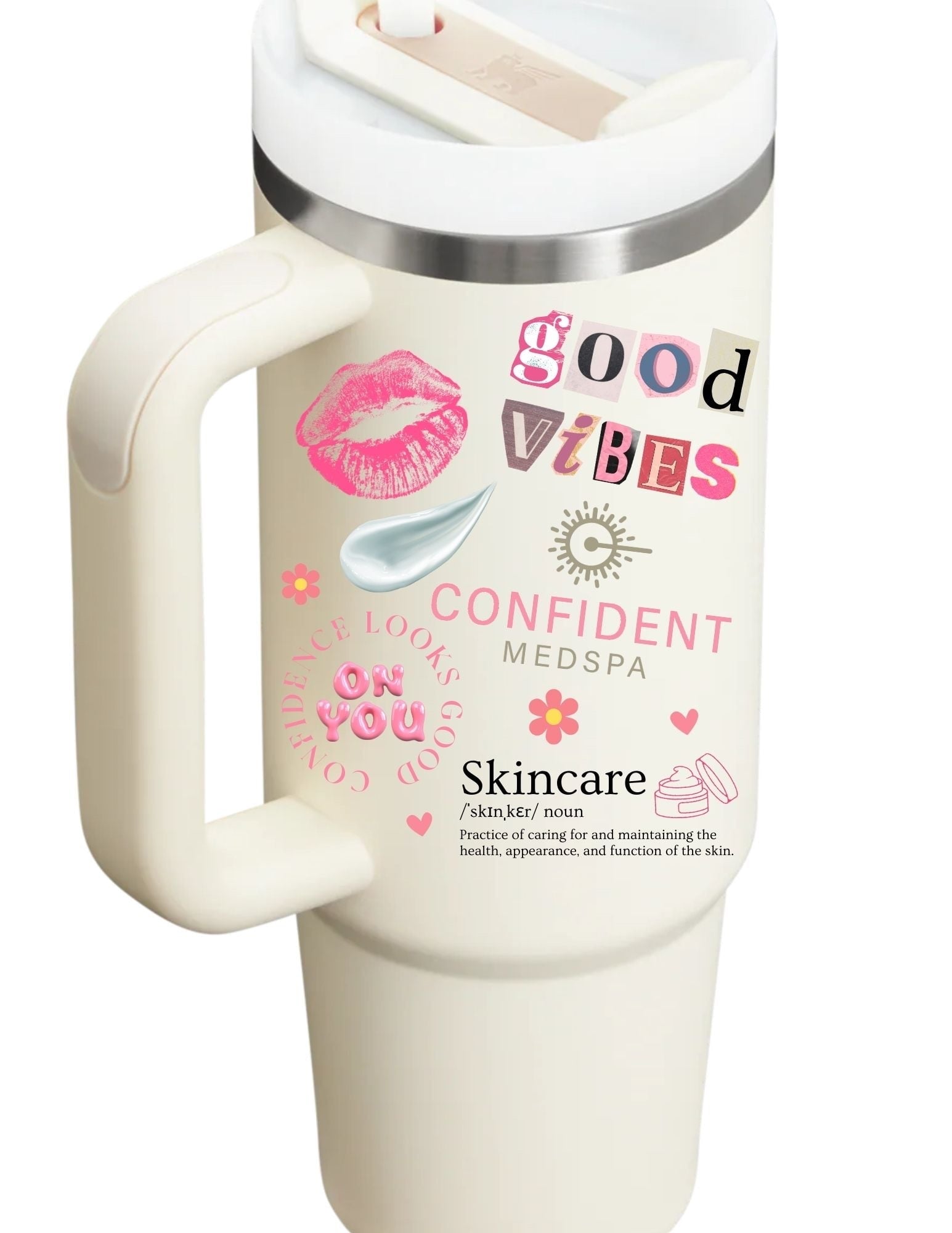 Confident Med Spa – Cream Stanley Cup with UV-DTF Printed Designs Sip in style with this elegant cream Stanley cup, featuring permanent UV-DTF printed floral and aesthetic-inspired imagery. The vibrant, full-color designs capture the sophisticated and modern essence of Confident Med Spa, making every drink a chic experience.