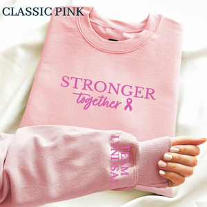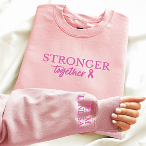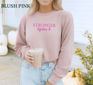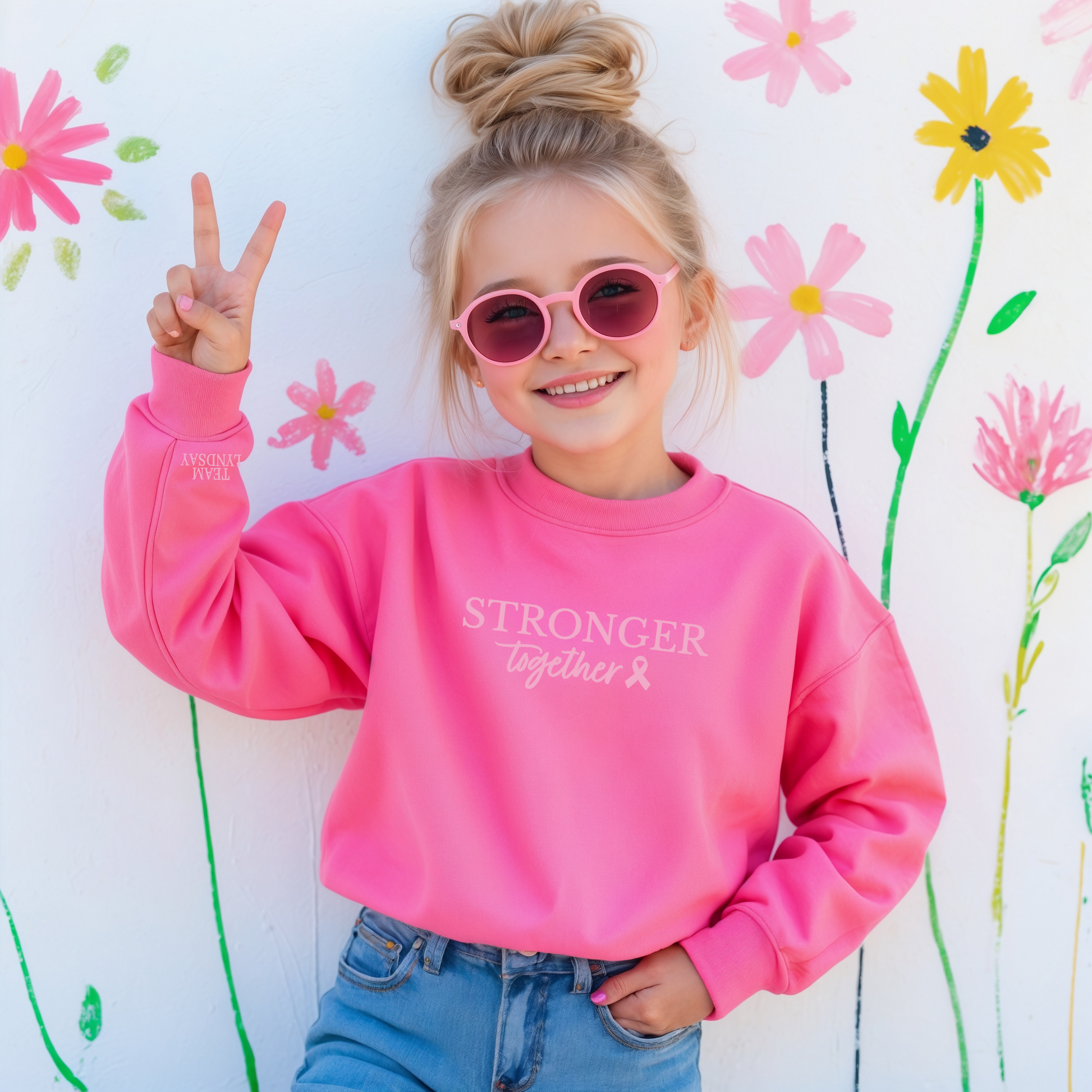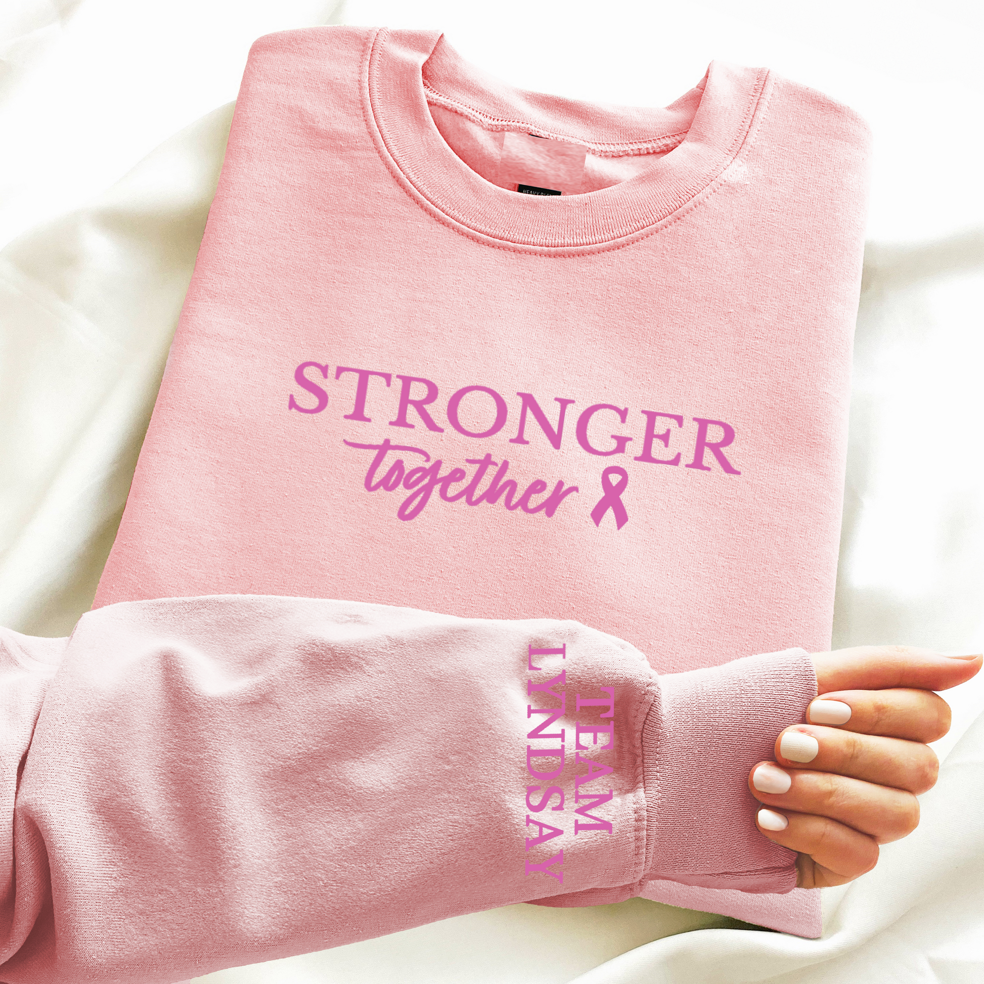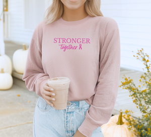 Show your support and spread hope with our Stronger Together crew pullover — a soft and cozy unisex Jerzees sweatshirt created in honor of Lyndsay’s fight against breast cancer. Available in blush pink and classic pink, this pullover combines comfort and purpose, reminding us all that no one fights alone.