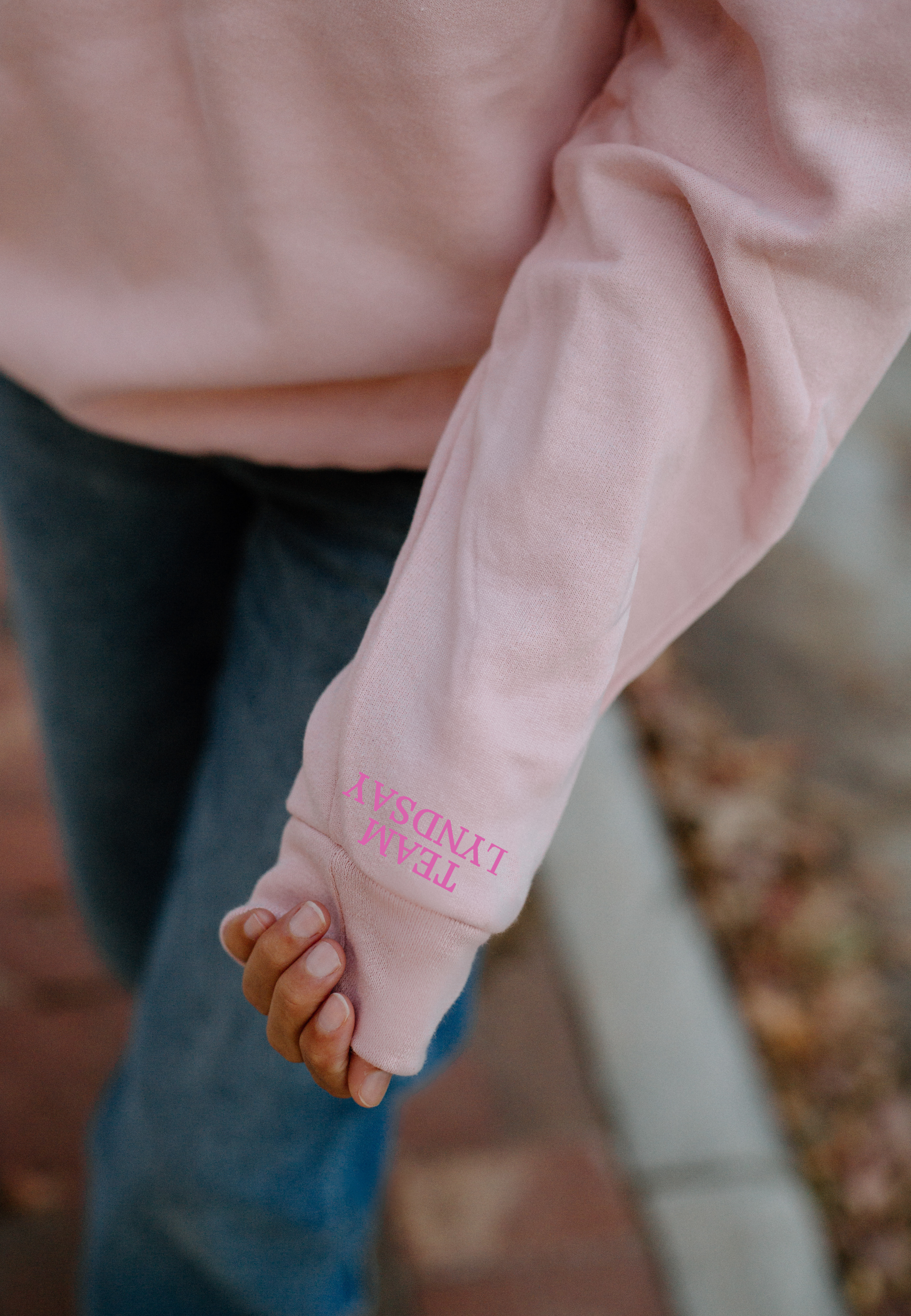 Made with a midweight cotton-blend fleece, it’s perfect for everyday wear, featuring a relaxed unisex fit that’s true to size — size up for a cozy, oversized look. The front displays the empowering message “Stronger Together” with the iconic breast cancer ribbon, while the sleeve proudly reads “Team Lyndsay” as a symbol of unity and strength.